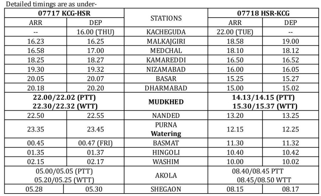 07717 काचीगुड़ा से दिनांक 17 एप्रिल से 26 जून तक, प्रत्येक गुरुवार को दोपहर 16:00 बजे हिसार के लिए रवाना होगी। वापसी में 07718 हिसार से दिनांक 20 एप्रिल से 29 जून तक प्रत्येक रविवार को रात 23:00 बजे काचीगुड़ा के लिए रवाना होगी।