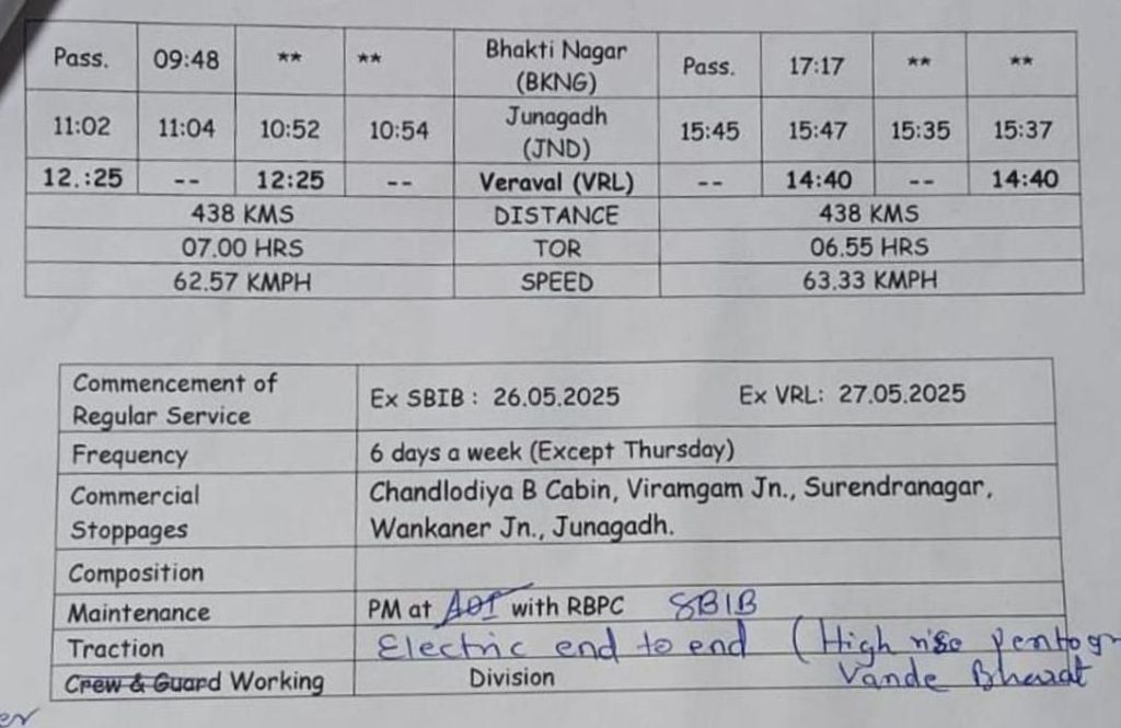 26901 साबरमती वेरावळ वन्देभारत दिनांक 26 मई 2025 से प्रत्येक गुरुवार छोड़कर सप्ताह में छह दिन सुबह 05:25 को साबरमती से रवाना होकर दोपहर 12:25 को वेरावळ पहुँचेंगी। वापसी में 26902 वेरावळ साबरमती वन्देभारत दिनांक 27 मई 2025 से प्रत्येक गुरुवार छोड़कर सप्ताह में छह दिन दोपहर 14:40 को वेरावळ से रवाना होकर रात 21:35 को साबरमती पहुँचेंगी।