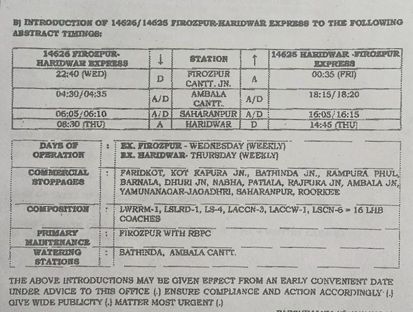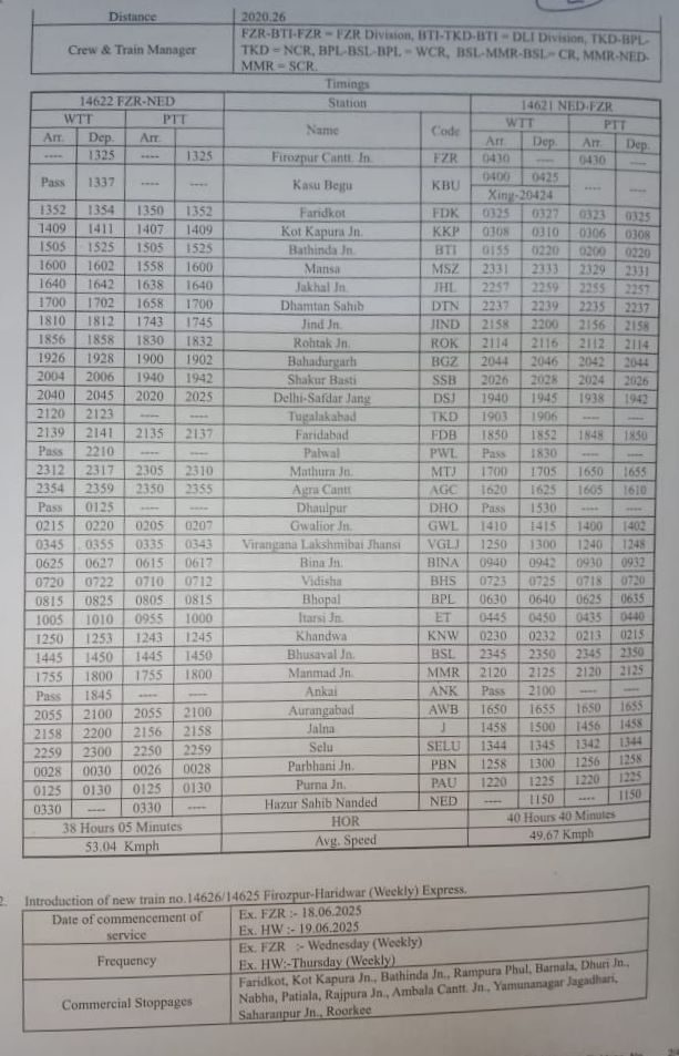 दिनांक 13 जून 2025 शुक्रवार से फिरोजपुर से चल पड़ेंगी 14622 और 15 जून से हुजुरसाहिब नान्देड़ से रवाना होंगी। निम्नलिखित है, समयसारणी।