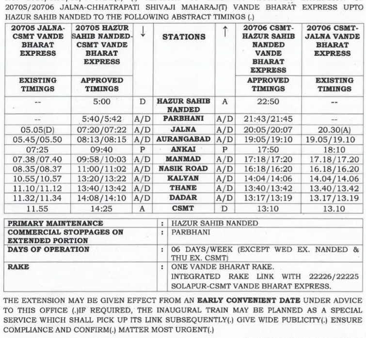 20705/06 जालना छत्रपति शिवाजी महाराज टर्मिनस मुम्बई जालना वन्देभारत एक्सप्रेस का हुजुरसाहिब नान्देड़ तक विस्तार किया जा रहा है। रेल मुख्यालय ने नान्देड़ के लिए एक बहुत अर्से से चली माँग को अनुमति दे दी है और जल्द ही इस पर कार्रवाई करने के आदेश सम्बन्धित रेलवे को दे दिए है।