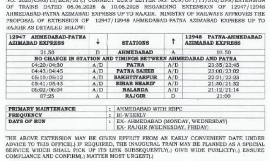 12947/48 अहमदाबाद पटना अहमदाबाद द्विसाप्ताहिक अज़ीमाबाद एक्सप्रेस का पटना से आगे राजगीर तक विस्तार घोषित किया गया है। यह गाड़ी अहमदाबाद से पटना तक नियमित समयसारणी के अनुसार चलकर पटना से आगे पटनासाहिब, बख्तियारपुर, बिहारशरीफ, नालन्दा होते हुए राजगीर तक विस्तारित होंगी। गाड़ी के परिचालन दिनोंमें कोई बदलाव नही होगा।