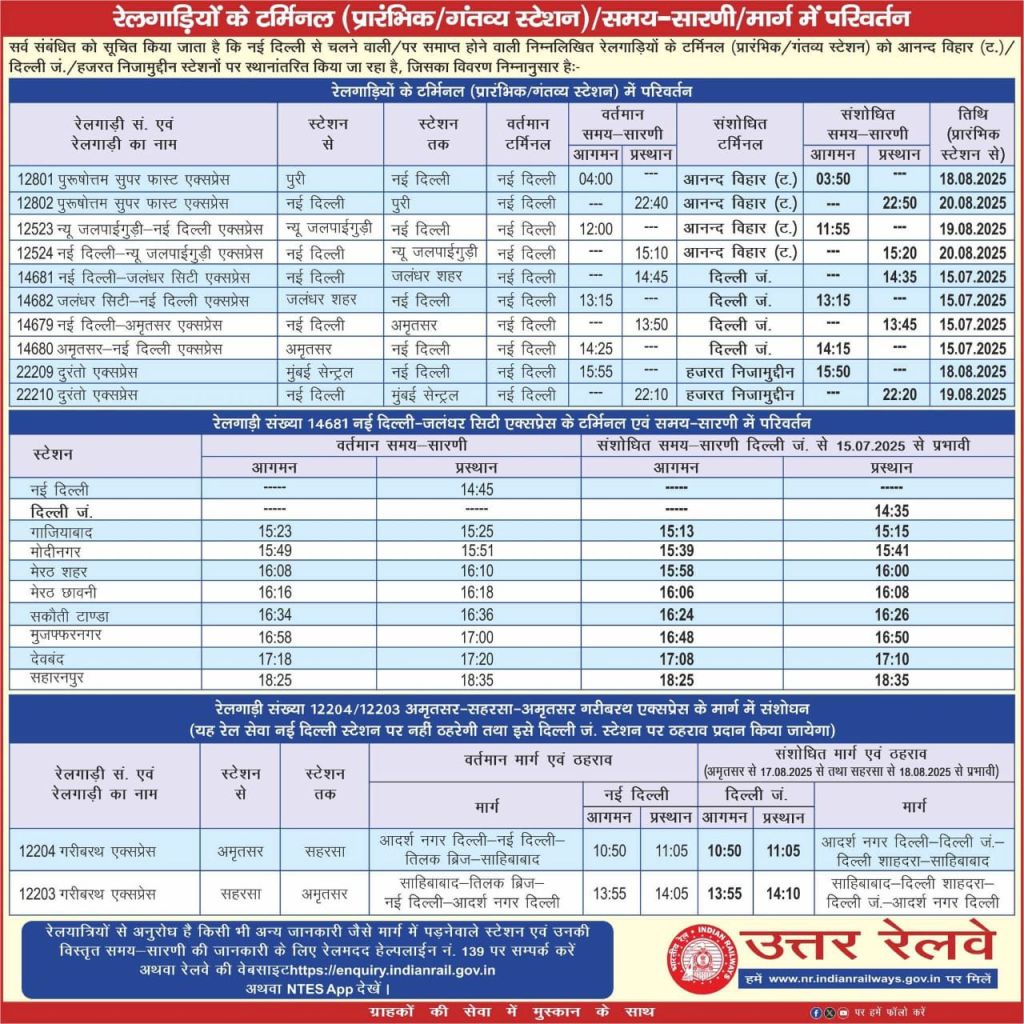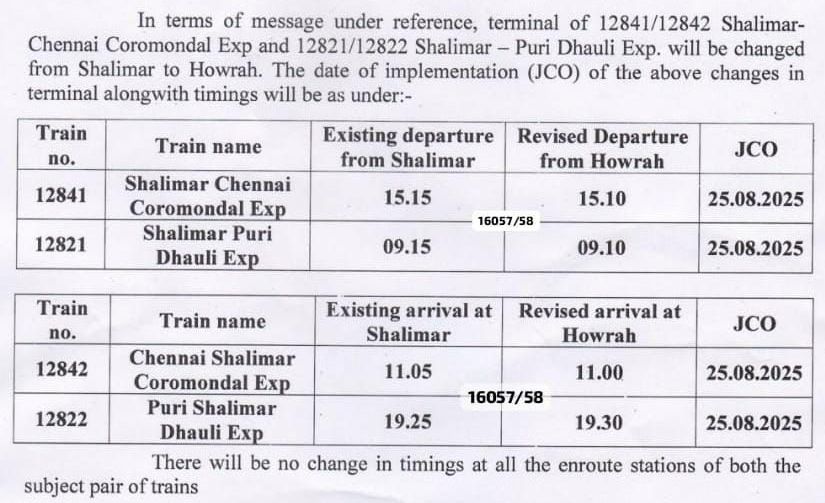12841/42 शालीमार पुरुच्ची थलाइवार डॉ एम जी रामचन्द्रन चेन्नई सेंट्रल शालीमार प्रतिदिन कोरोमण्डल सुपरफास्ट एक्सप्रेस एवं 12821/22 शालीमार पुरी शालीमार प्रतिदिन धौली सुपरफास्ट एक्सप्रेस का गन्तव्य स्टेशन दिनांक 25 अगस्त 2025 से, शालीमार से बदलकर हावड़ा किया जा रहा है। इन बदलाव के वजह से उक्त गाड़ियोंके टर्मिनल स्टेशन पर पहुँचने/छूटने के समय मे भी बदलाव होगा, जो निम्नलिखित है,
