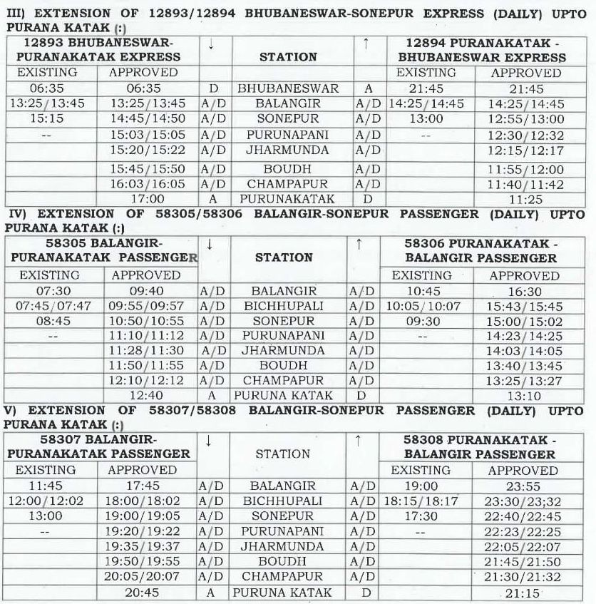 पूर्व तटीय रेलवे ECoR क्षेत्र में नई रेल लाइन पर दो जोड़ी नई साप्ताहिक गाड़ियाँ घोषित की गई है। 18313/14 बौध – नया भुबनेश्वर – बौध और 18311/12 सम्बलपुर बौध सम्बलपुर एक्सप्रेस। यह दोनों साप्ताहिक गाड़ियाँ 22803/04 शालीमार सम्भलपुर शालीमार के रैक से संचालित की जाएगी। इसके साथ ही 12893/94 भुबनेश्वर सोनपुर भुबनेश्वर प्रतिदिन एक्सप्रेस और 58305/06/07/08 बालनगीर सोनेपुर बालनगीर सवारी इन चार गाड़ियोंका पुरुणाकटक तक विस्तार किए जाने की भी घोषणा की गई है।