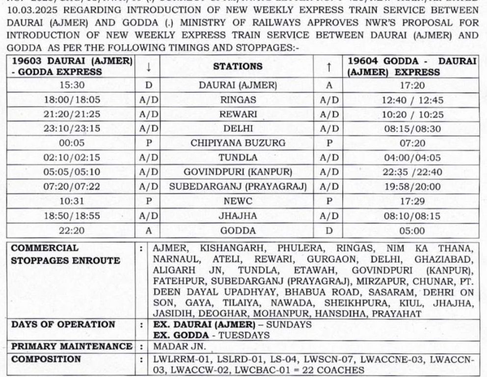 19603/04 दौराई – गोड्डा – दौराई साप्ताहिक एक्सप्रेस