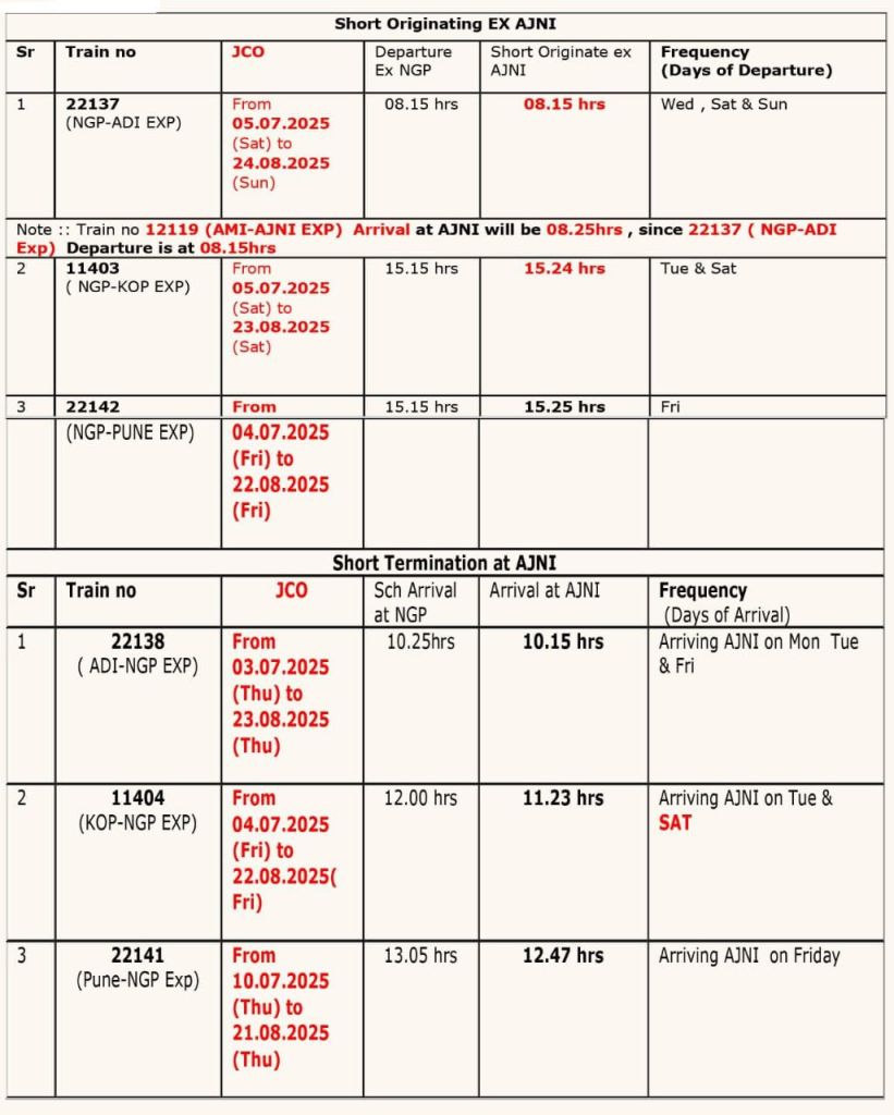 1: 22137 नागपुर अहमदाबाद प्रेरणा त्रिसाप्ताहिक सुपरफास्ट एक्सप्रेस JCO दिनांक 05 जुलाई से 24 अगस्त तक अजनी से सुबह 8:15 को रवाना होगी।