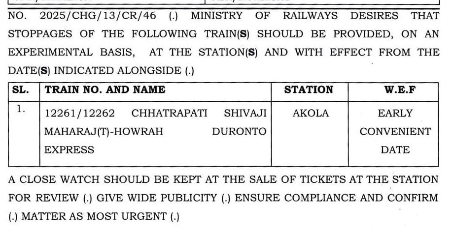 अकोला स्टेशन पर यात्रिओंकी पुरजोर माँग के चलते और स्थानीय सांसद के आग्रह पर दो यात्री गाड़ियोंको स्टॉपेज मिलने जा रहे है।