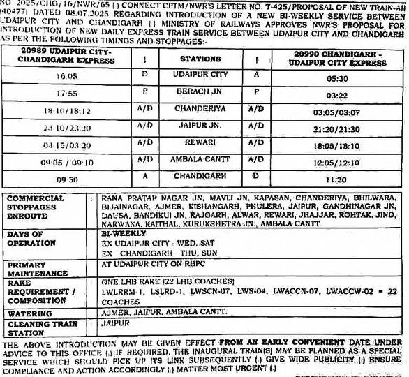 20989/90 उदयपुर सिटी – चंडीगढ़ – उदयपुर सिटी द्विसाप्ताहिक सुपरफास्ट