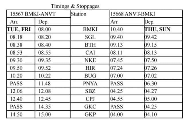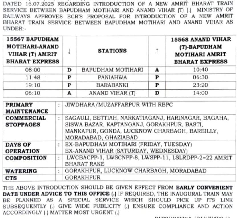 15567 अमृतभारत एक्सप्रेस दिनांक 30 जुलाई से प्रत्येक मंगलवार एवं शुक्रवार को बापूधाम मोतिहारी से सुबह 8:00 रवाना होगी और अगले दिन प्रातः 6:10 को आनन्द विहार टर्मिनस पहुँचेंगी। वापसी में 15568 अमृतभारत एक्सप्रेस दिनांक 29 जुलाई से प्रत्येक बुधवार एवं शनिवार को से दोपहर 14:00 आनन्द विहार टर्मिनस रवाना होगी और अगले दिन सुबह 10:40 को बापूधाम मोतिहारी पहुँचेंगी।