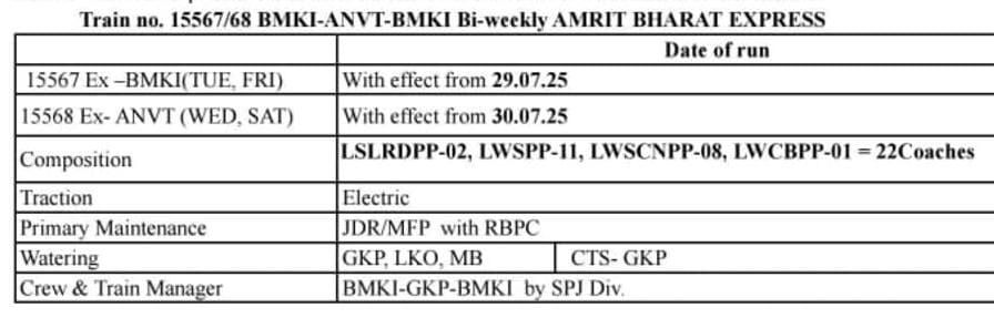 बिहार के लिए घोषित चार अमृतभारत एक्सप्रेस गाड़ियोंमे से तीन की जानकारी हम पहले दे चुके है। आज लीजिए, यह चौथी अमृतभारत एक्सप्रेस जो द्विसाप्ताहिक सेवा देंगी।