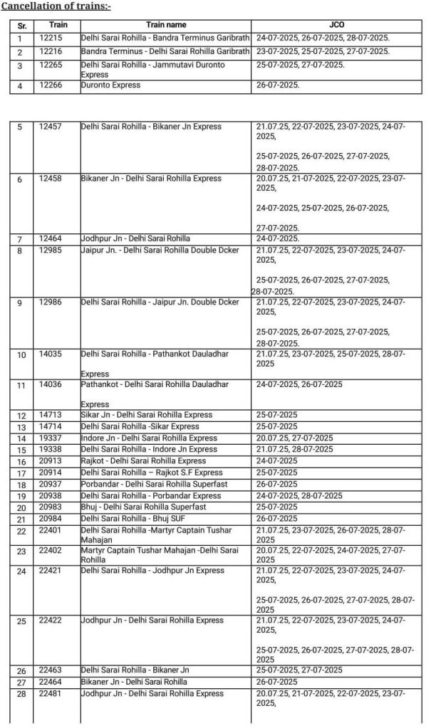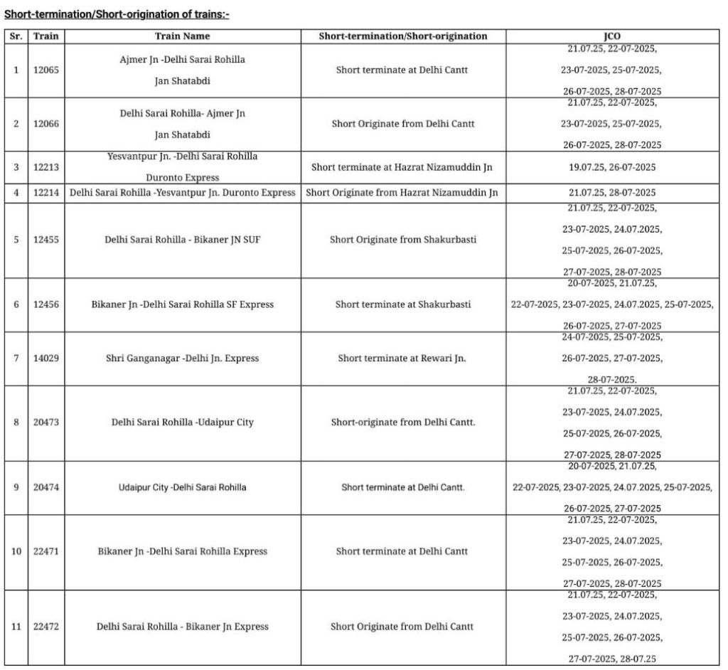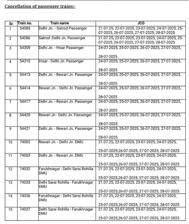 दिल्ली सराय रोहिल्ला स्टेशन पर रेल सिग्नलिंग प्रणाली को अद्ययावत किया जा रहा है अतः रेल ब्लॉक के चलते राजस्थान से दिल्ली की ओर जाने वाली पश्चिम रेल और उपरे की कई गाड़ियाँ रद्द, आँशिक रद्द की जा रही है। उक्त ब्लॉक 21 जुलाई से 28 जुलाई तक रहेगा।