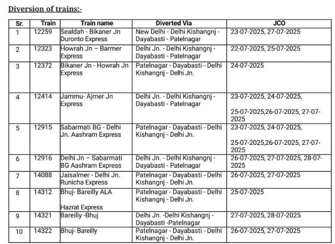 निम्नलिखित 23 गाड़ियाँ मार्ग परिवर्तन कर चलाई जाएंगी।
