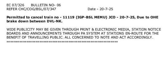 11119 इगतपुरी भुसावल एक्सप्रेस JCO 20 जुलाई रद्द रहेगी।