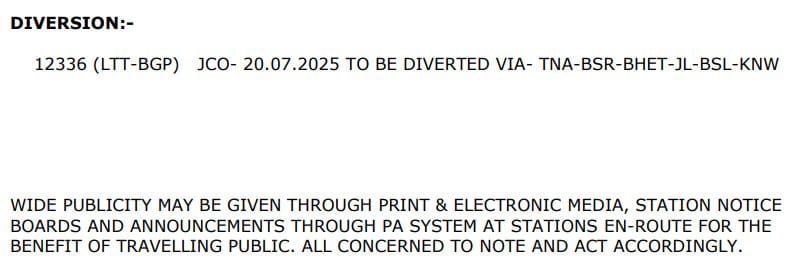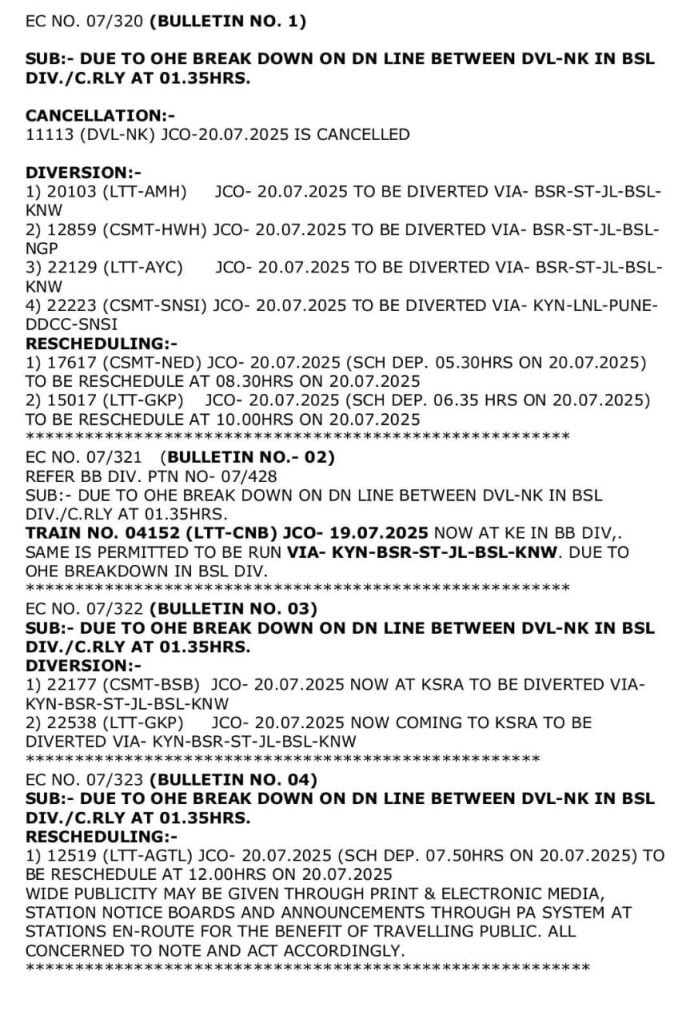 परावर्तित मार्ग : वसई रोड, सूरत, जलगाँव, भुसावल (सभी गाड़ियाँ JCO 20 जुलाई 2025)