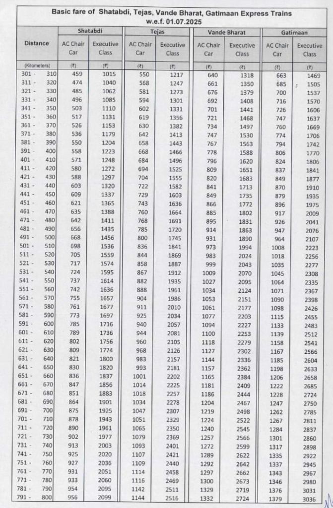 किराया तालिका में 491 से 500 किलोमीटर के बेसिक किराए वातानुकूलित चेयर कार (CC) के लिए ₹931/- और एग्जीक्यूटिव चेयर कार (EC) के लिए ₹1890/- दर्ज है।