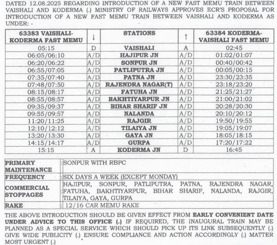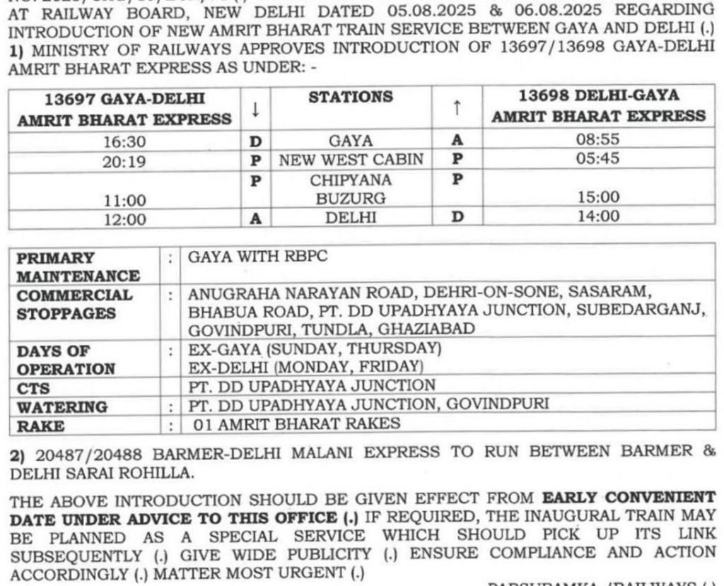 बिहार पर नई रेल यात्री सेवाओं की बौछार जारी है। गया – दिल्ली के बीच द्विसाप्ताहिक अमृतभारत एक्सप्रेस एवं वैशाली – कोडरमा के बीच छह दिवसीय बुद्धिस्ट सर्किट मेमू की घोषणा की गई है। रेल प्रशासन ने इस सम्बध में निम्नलिखित परिपत्रक जारी किए है,