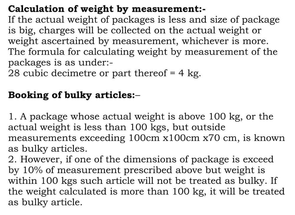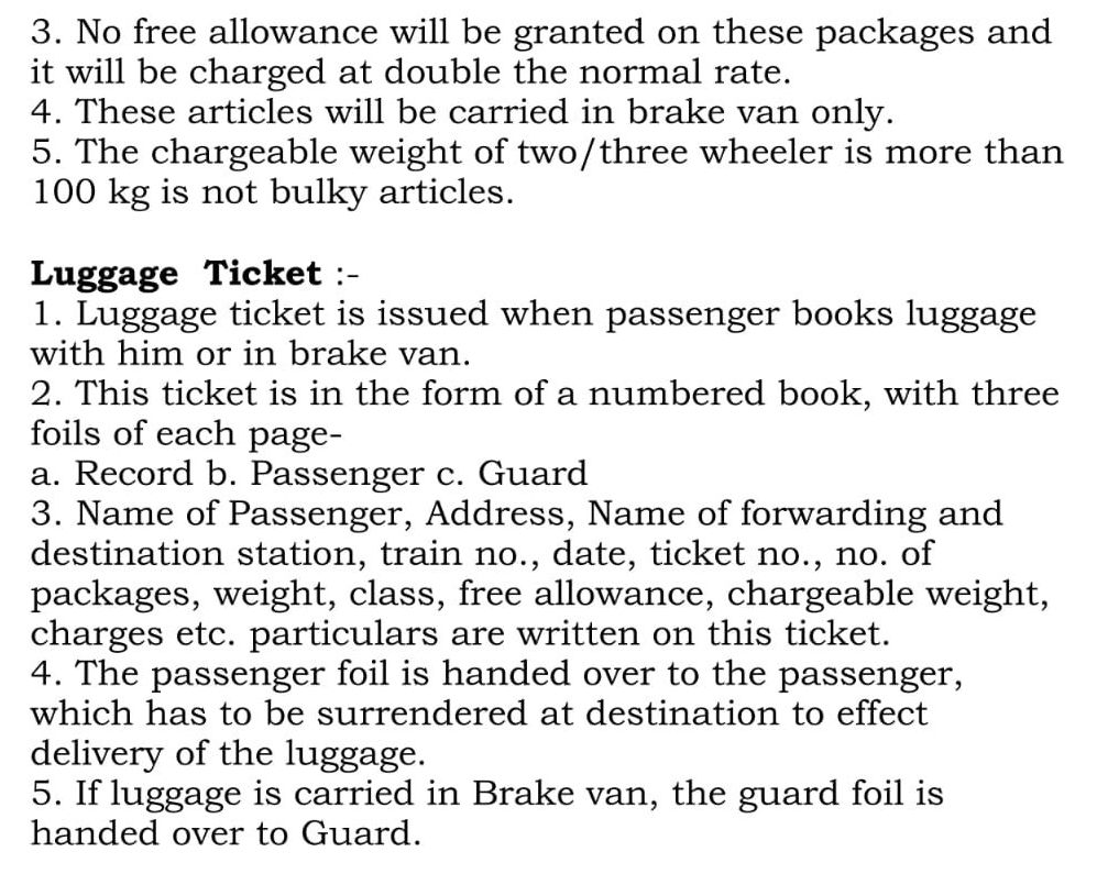 बल्कि लगेज की परिभाषा : 100 किलो से ज्यादा या 100x100x70 cm से ज्यादा का आकारमान को बल्कि लगेज समझा जाता है। जिसके बुकिंग रेट ज्यादा होते है और केवल गार्ड के साथ ही ले जाया जाता है।