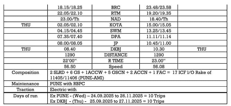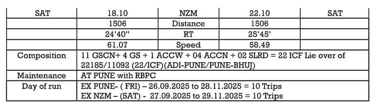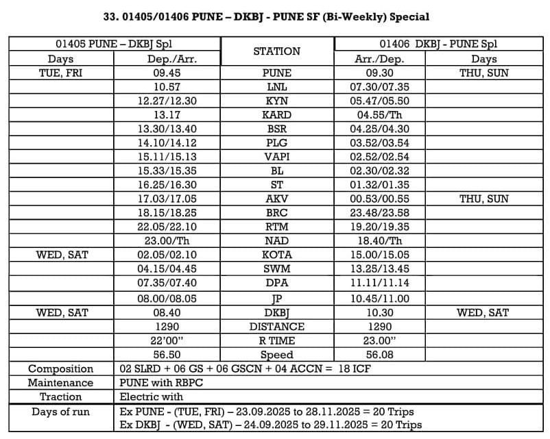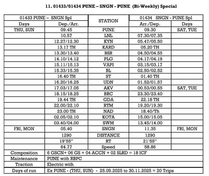 11 : 01433/34 पुणे सांगानेर पुणे द्विसाप्ताहिक विशेष 25/9 से 01/12 तक 20-20 फेरे