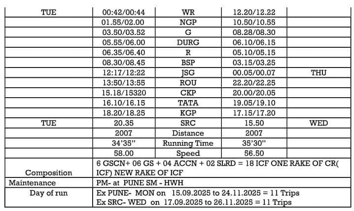 7: 01431/32 पुणे हज़रत निजामुद्दीन पुणे साप्ताहिक विशेष 26/9 से 29/11 तक 10-10 फेरे