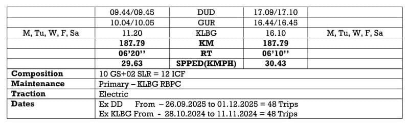 22 : 01421/22 दौंड कलबुरगी दौंड अनारक्षित सप्ताह मे पाँच दिवसीय परिचालित विशेष 26/9 से 11/11 तक 48-48 फेरे