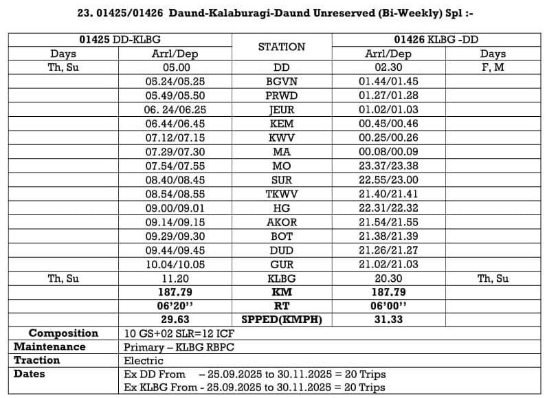 23 : 01425/26 दौंड कलबुरगी दौंड अनारक्षित द्विसाप्ताहिक विशेष 25/9 से 30/11 तक 20-20 फेरे