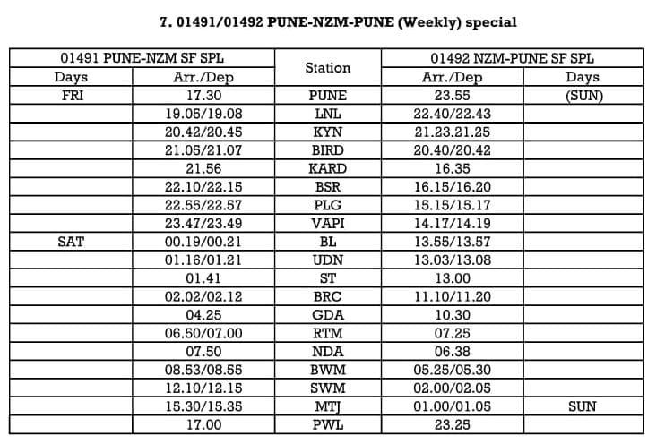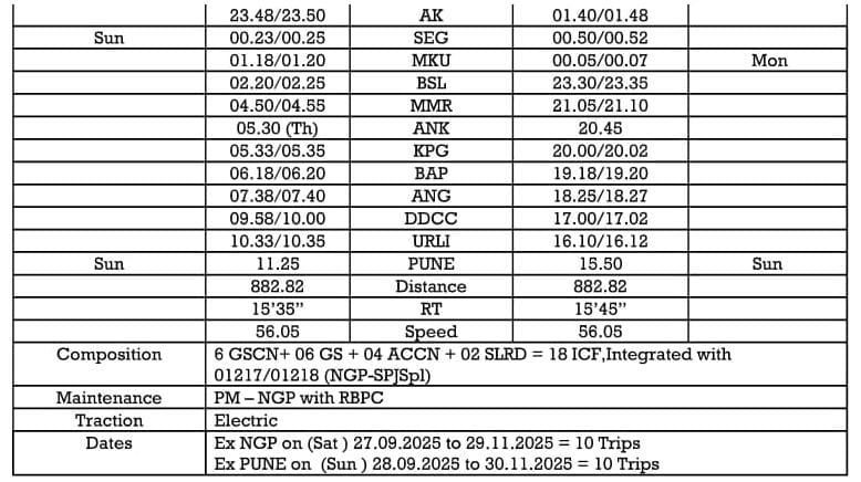 19 : 01201/02 नागपूर पुणे नागपूर द्विसाप्ताहिक विशेष 29/9 से 28/11 तक 18-18 फेरे