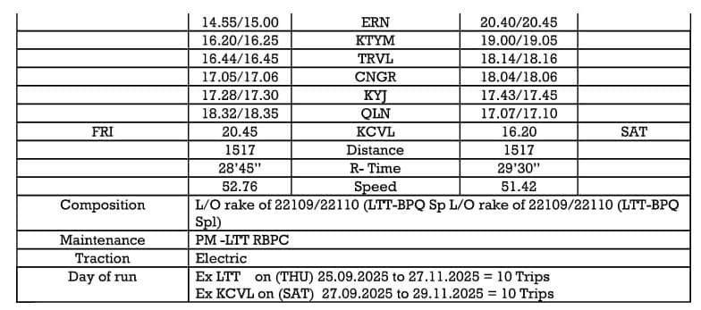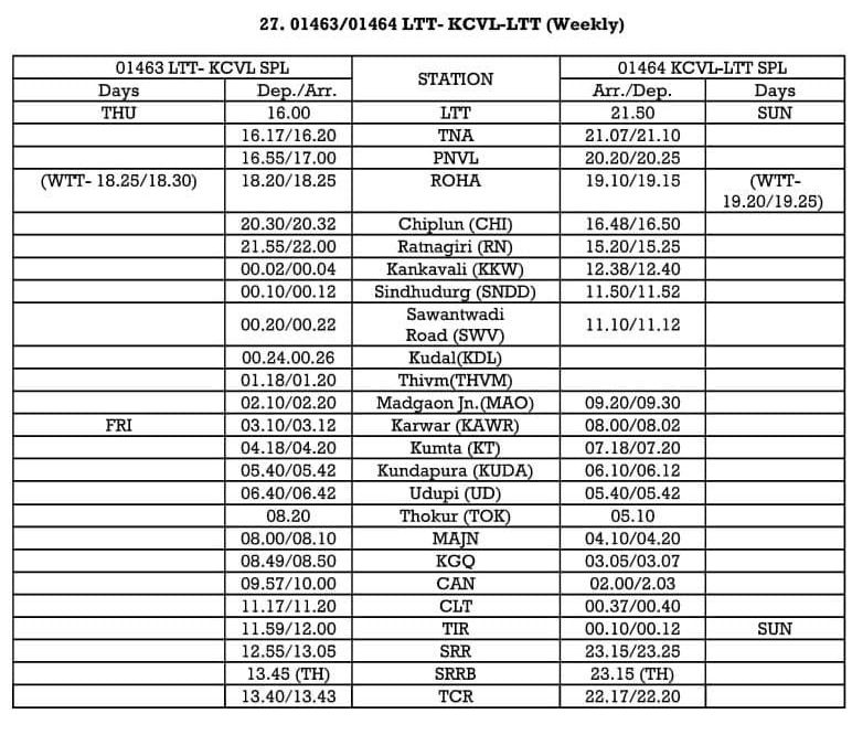 27 : 01463/64 लोकमान्य तिलक टर्मिनस कोचुवेळी लोकमान्य तिलक टर्मिनस साप्ताहिक विशेष दिनांक 25/9 से 29/11 तक 10-10 फेरे