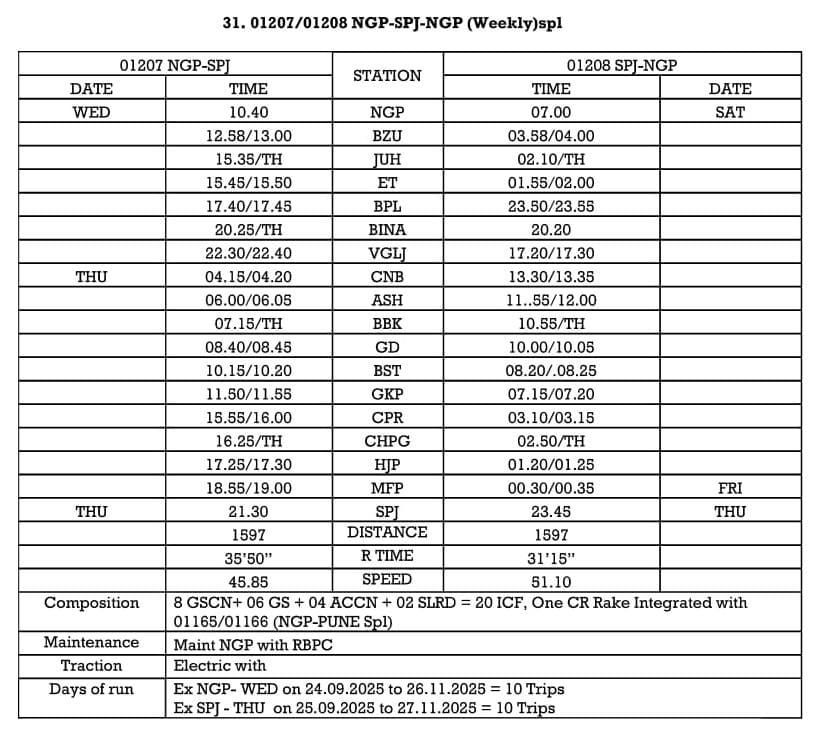 31 : 01207/08 नागपुर समस्तीपुर नागपुर साप्ताहिक विशेष दिनांक 24/9 से 27/11 तक 10-10 फेरे