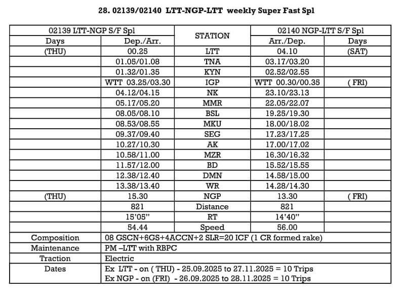 28 : 02139/40 लोकमान्य तिलक टर्मिनस नागपुर लोकमान्य तिलक टर्मिनस साप्ताहिक सुपरफास्ट विशेष दिनांक 25/9 से 28/11 तक 10-10 फेरे