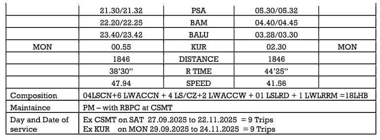 25 : 01105/01106 मुम्बई छत्रपति शिवाजी महाराज टर्मिनस लातूर मुम्बई छत्रपति शिवाजी महाराज टर्मिनस साप्ताहिक विशेष 26/9 से 28/11 तक 10 – 10 फेरे