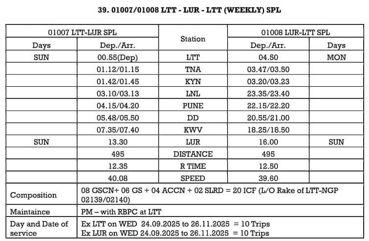 39 : 01007/08 लोकमान्य तिलक टर्मिनस लातूर लोकमान्य तिलक टर्मिनस साप्ताहिक विशेष दिनांक 24/09 से 26/11 तक 10-10 फेरे
