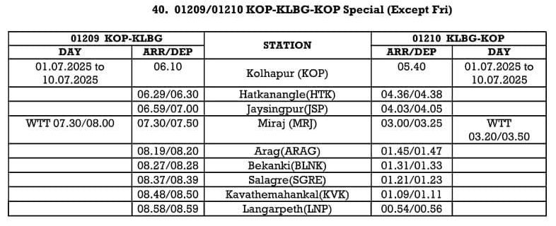 40 : 01209/10 कोल्हापुर कलबुर्गी कोल्हापुर सप्ताह में छह दिवसीय परिचालित विशेष दिनांक 24/9 से 30/11 तक 58-58 फेरे