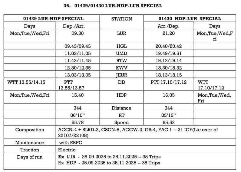 36 : 01429/30 लातूर हड़पसर लातूर सप्ताह में चार दिवसीय विशेष दिनांक 25/9 से 28/11 तक 35-35 फेरे