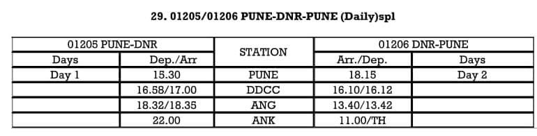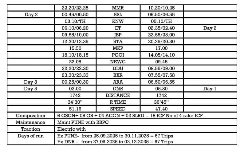 29 : 01205/06 पुणे दानापुर पुणे प्रतिदिन विशेष दिनांक 25/9 से 02/12 तक 67-67 फेरे