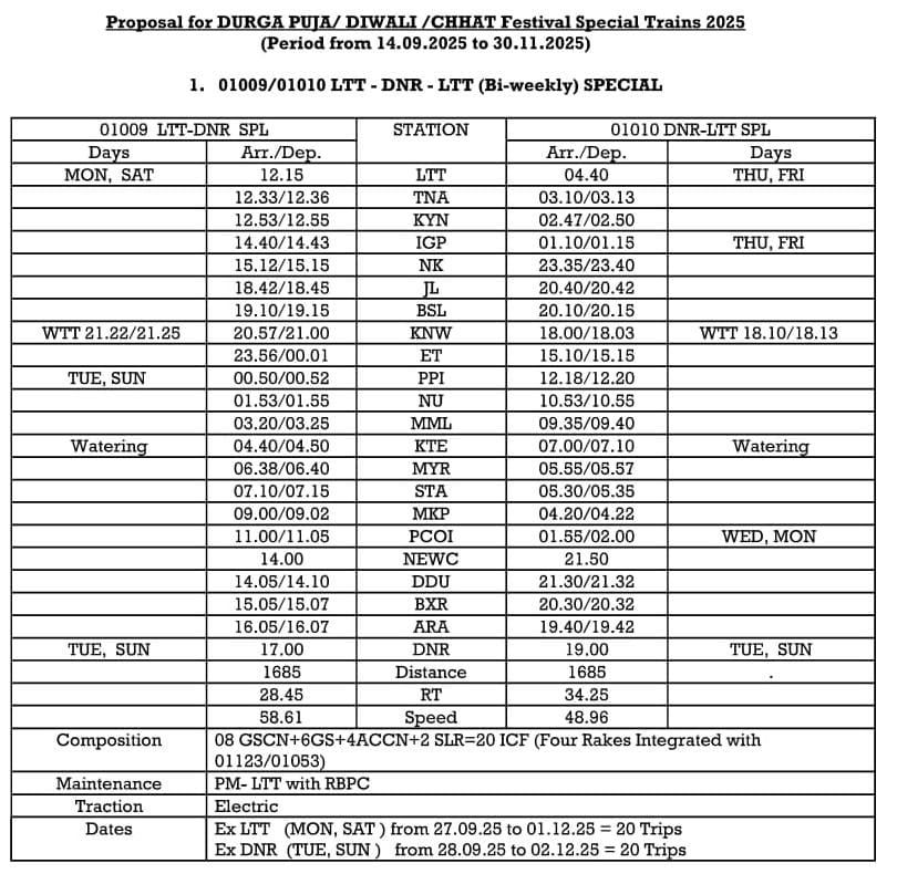 1: 01009/10 लोकमान्य तिलक टर्मिनस दानापुर लोकमान्य तिलक टर्मिनस द्विसाप्ताहिक विशेष दिनांक 27/9 से 02/12 तक 20-20 फेरे