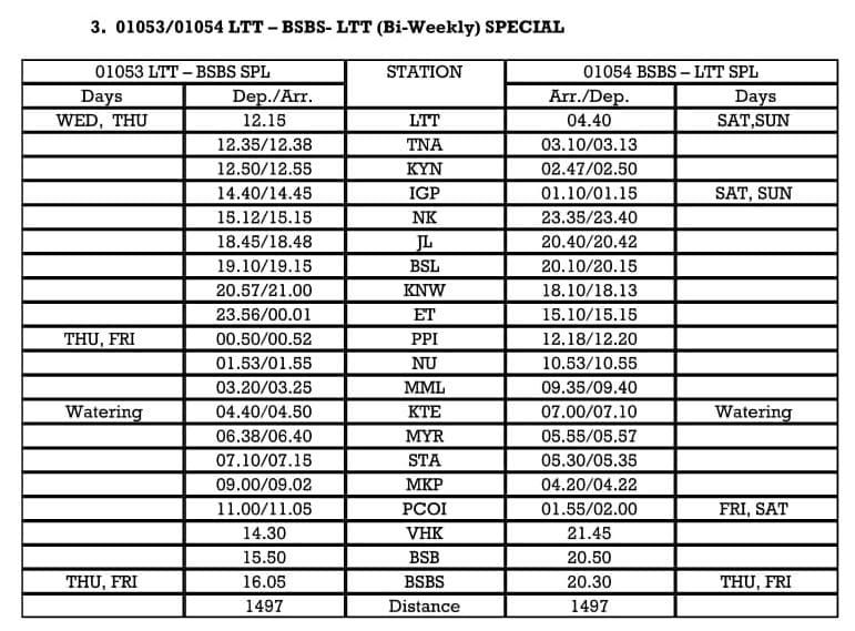 3: 01053/54 लोकमान्य तिलक टर्मिनस बनारस लोकमान्य तिलक टर्मिनस द्विसाप्ताहिक विशेष दिनांक 24/9 से 28/11 तक 20-20 फेरे