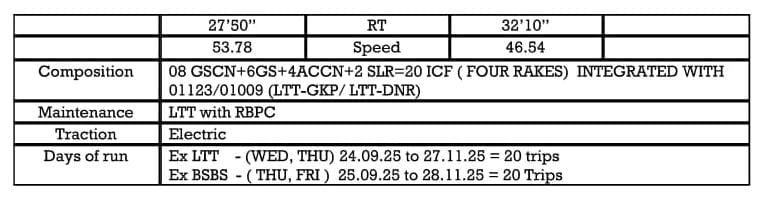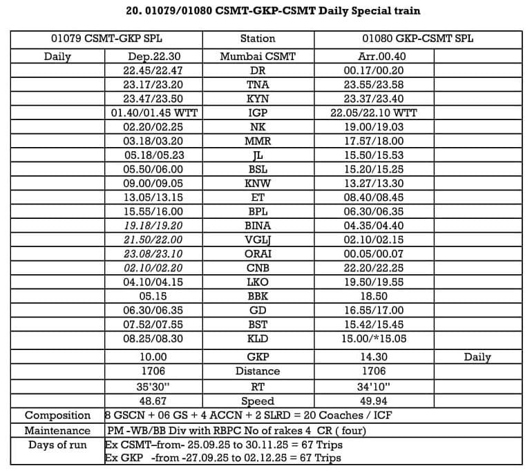 20 : 01079/01080 मुम्बई छत्रपति शिवाजी महाराज टर्मिनस गोरखपुर मुम्बई छत्रपति शिवाजी महाराज टर्मिनस प्रतिदिन विशेष 25/9 से 02/12 तक 67 – 67 फेरे