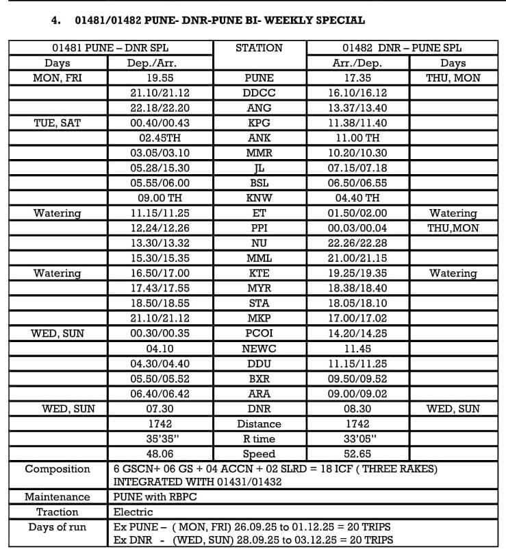 4: 01481/82 पुणे दानापुर पुणे द्विसाप्ताहिक विशेष 26/9 से 03/12 तक 20-20 फेरे