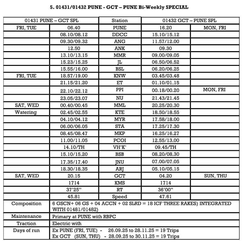 5: 01431/32 पुणे ग़ाज़ीपुर सिटी पुणे द्विसाप्ताहिक विशेष 26/9 से 30/11 तक 19-19 फेरे