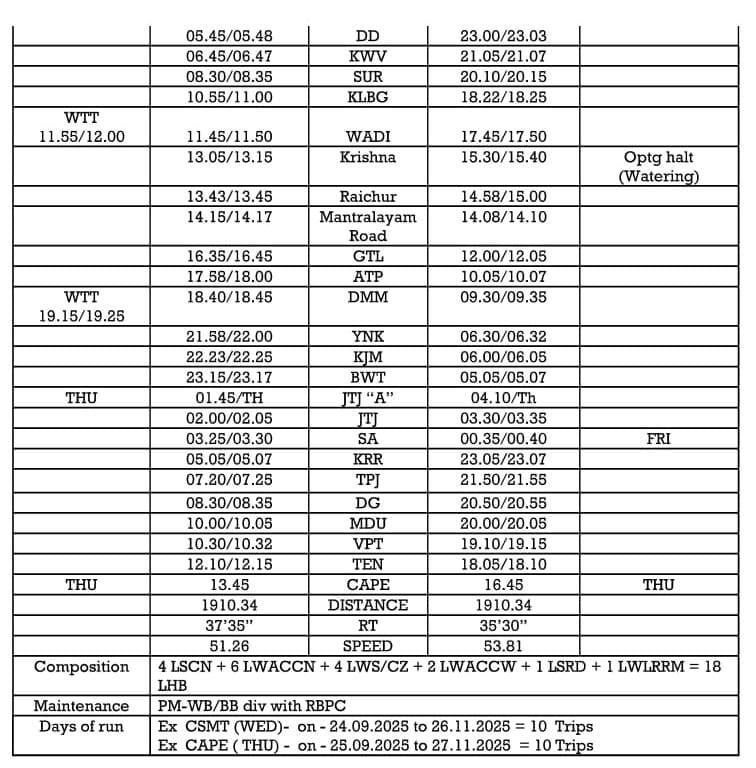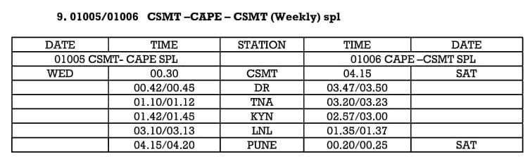9: 01005/06 मुम्बई छत्रपति शिवाजी महाराज टर्मिनस कन्याकुमारी मुम्बई छत्रपति शिवाजी महाराज टर्मिनस साप्ताहिक विशेष 24/9 से 27/11 तक 10-10 फेरे