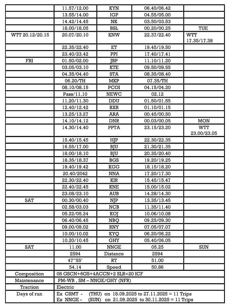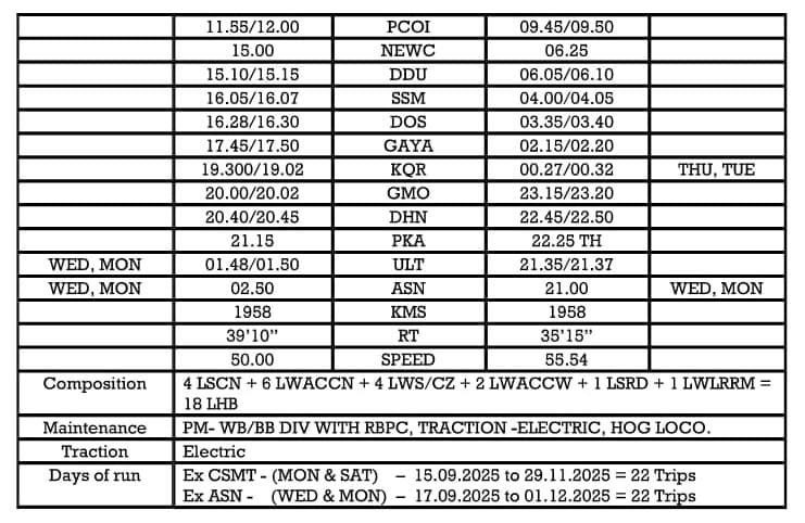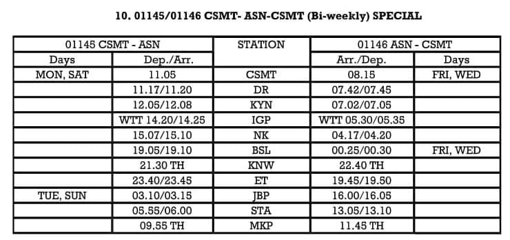 10 : 01145/46 मुम्बई छत्रपति शिवाजी महाराज टर्मिनस आसनसोल मुम्बई छत्रपति शिवाजी महाराज टर्मिनस द्विसाप्ताहिक विशेष 15/9 से 01/12 तक 22-22 फेरे