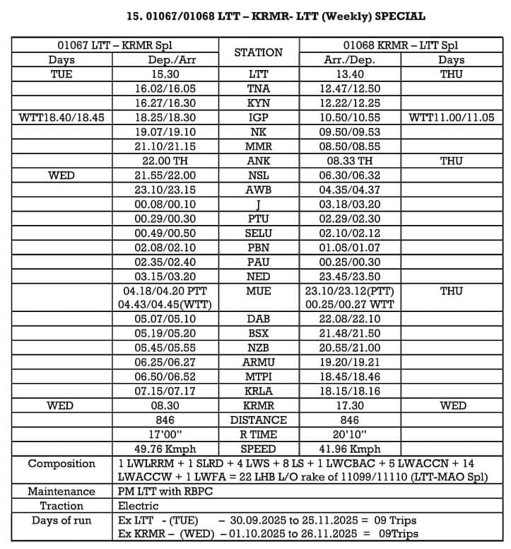 15 : 01067/68 लोकमान्य तिलक टर्मिनस करीमनगर लोकमान्य तिलक टर्मिनस साप्ताहिक विशेष 30/9 से 26/11 तक 09-09 फेरे