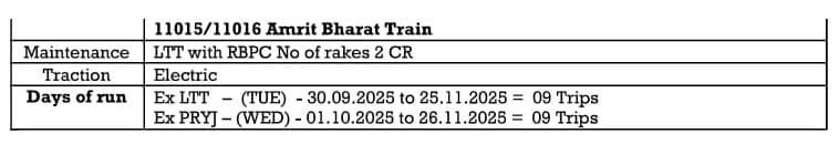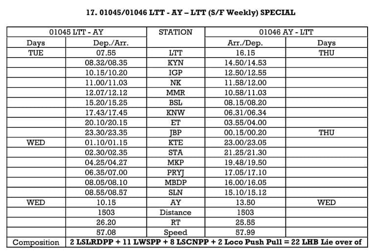 17 : 01045/46 लोकमान्य तिलक टर्मिनस अयोध्या धाम लोकमान्य तिलक टर्मिनस साप्ताहिक अमृत भारत विशेष 30/9 से 26/11 तक 09-09 फेरे