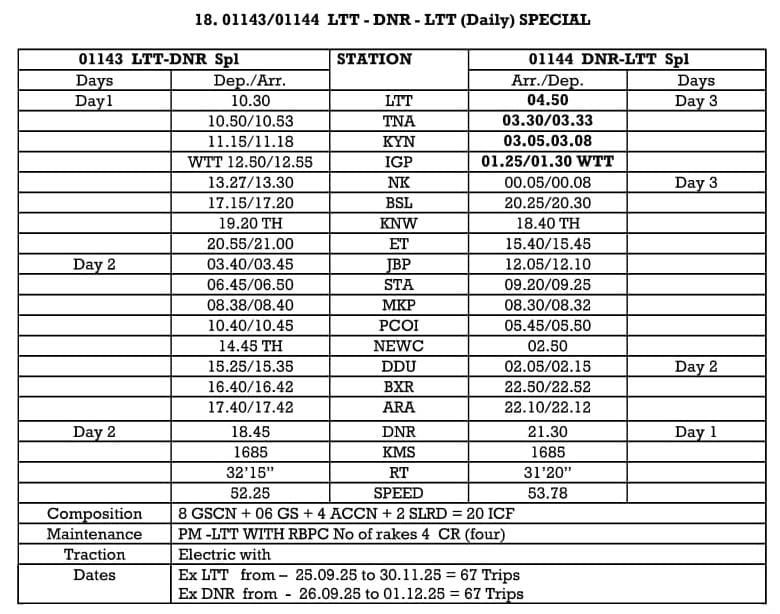 18 : 01143/44 लोकमान्य तिलक टर्मिनस दानापुर लोकमान्य तिलक टर्मिनस प्रतिदिन विशेष 25/9 से 01/12 तक 67-67 फेरे
