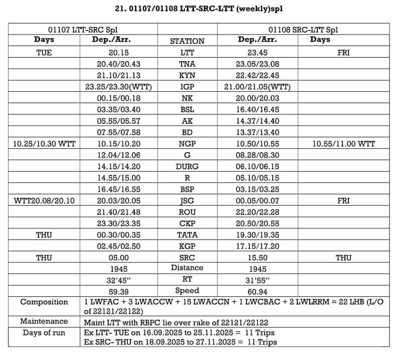 21 : 01107/08 लोकमान्य तिलक टर्मिनस संतरागाछी लोकमान्य तिलक टर्मिनस साप्ताहिक विशेष 16/9 से 27/11 तक 11-11 फेरे