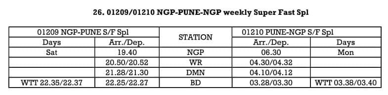 26 : 01209/10 नागपुर पुणे नागपुर साप्ताहिक सुपरफास्ट विशेष दिनांक 27/9 से 30/11 तक 10-10 फेरे
