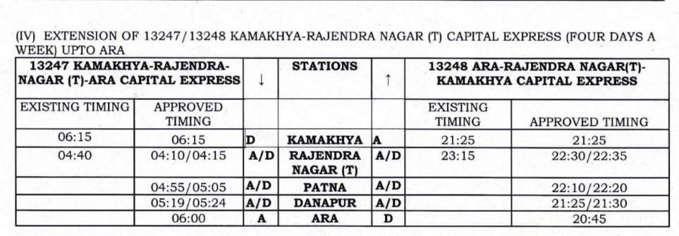 7 : 13248/47 राजेन्द्र नगर टर्मिनस कामाख्या राजेन्द्र नगर टर्मिनस सप्ताह में चार दिवसीय परिचालित, कैपिटल एक्सप्रेस का राजेन्द्र नगर से आगे आरा तक विस्तार
