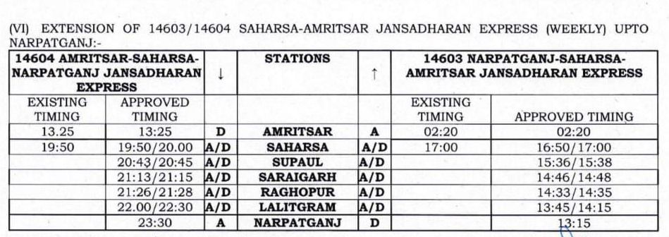 9 : 14603/04 सहरसा अमृतसर सहरसा साप्ताहिक जनसाधारण एक्सप्रेस का विस्तार सहरसा से आगे नरकटियागंज तक किया जा रहा है।