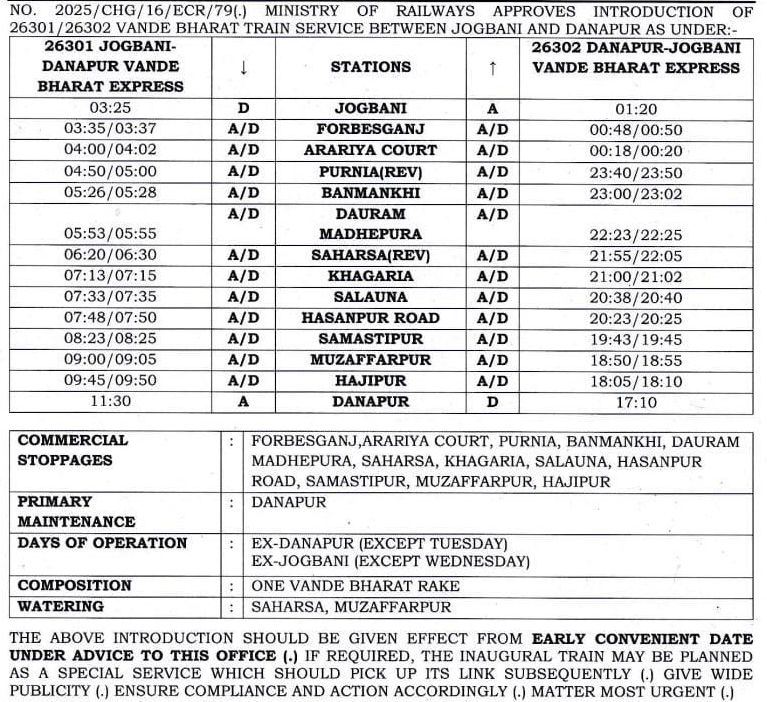 1 : 26301/02 जोगबनी दानापुर जोगबनी वन्देभारत एक्सप्रेस (सप्ताह में छह दिन परिचालित)