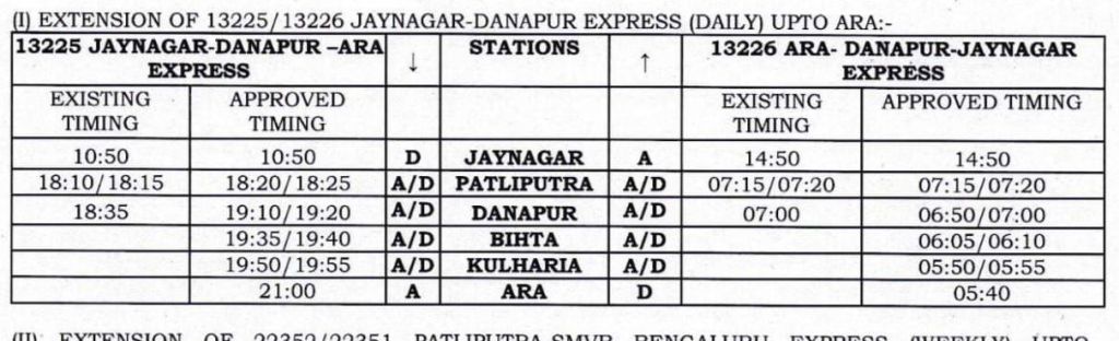 1: 13225/26 जयनगर दानापुर जयनगर प्रतिदिन इंटरसिटी एक्सप्रेस का दानापुर से आगे आरा तक विस्तार