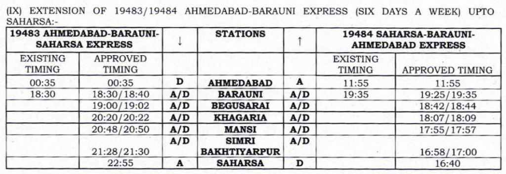 3 : 19483/84 अहमदाबाद बरौनी अहमदाबाद सप्ताह में छह दिन परिचालित एक्सप्रेस का बरौनी से आगे सहरसा तक विस्तार